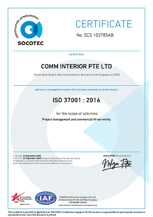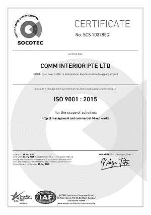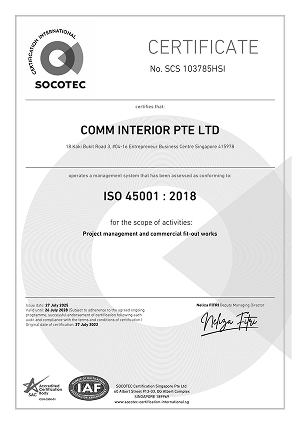 At Comm Interior Pte Ltd, operational excellence, workplace safety, ethical governance, and environmental responsibility form the foundation of our business. Our internationally recognised certifications demonstrate our commitment to delivering high-quality commercial fit-out projects with integrity and compliance.
