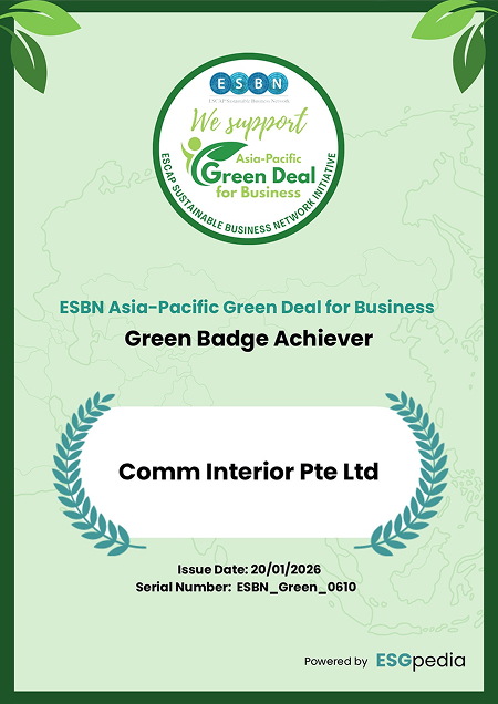 Comm Interior Pte Ltd is proud to be recognised as an ESBN Green Badge Achiever under the ESBN Asia-Pacific Green Deal for Business. Issued on 20 January 2026, this certification reflects our commitment to responsible interior solutions, sustainable material selection, and environmentally conscious project delivery across Singapore and the region.